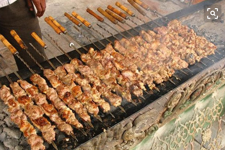 在新疆无论到哪里都有烤羊肉串。库车有一种米特尔喀瓦甫一米长的羊肉串),这种巨型羊肉串,吃起来才过瘾,吃上2-3串,即可饱肚。