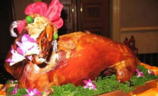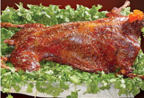 羊烤好后,放在餐车上,系上红色头结,嘴里含上芹菜或香菜,犹如一只活羊卧着吃草。那被烤得黄里透油的光泽,那扑鼻的香味诱惑,以及那动人的艺术造型,顿时会使人垂涎欲滴,食欲大增。可以自己动手用刀削下来吃,也可以请服务员切好后送上来吃。南疆的巴扎上哪里有烤全羊出售,哪里就是生意最兴隆的地方。烤全羊是新疆少数民族,尤其是维吾尔族人民膳食中的一道传统地方风味肉制品,一道最富有民族特色的大菜。维吾尔族最喜欢的烤全羊,是该民族千百年来游牧生活中传承的传统佳肴,是用来招待贵宾的。